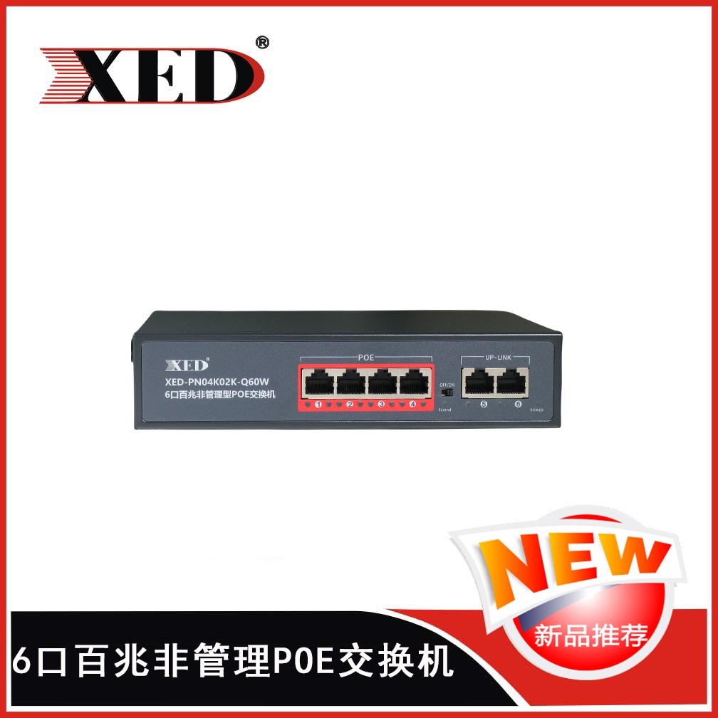 XED-PN04K02K-Q60W是一款高性能的百兆POE交換機,可通過網線為無線AP,攝像頭等PD設備提供最大單端口30W...