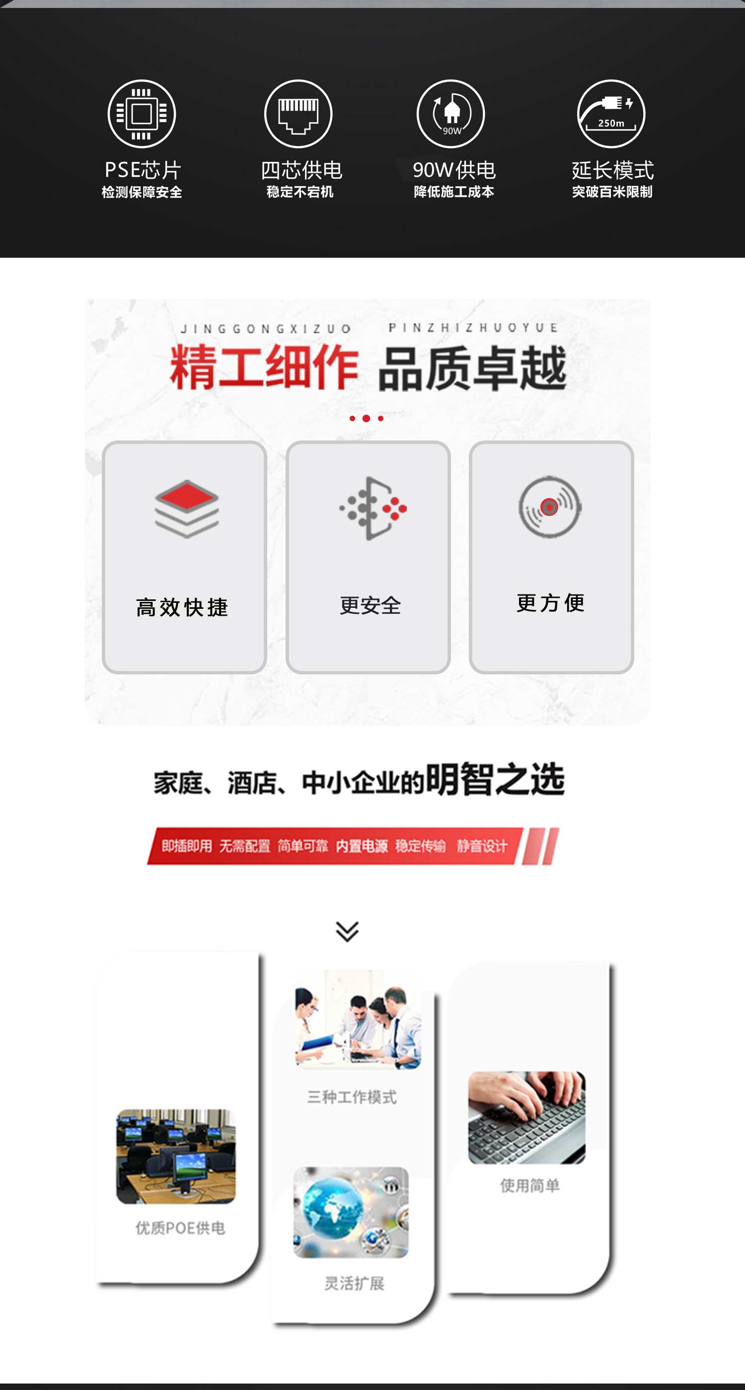 支持IEEE802.3at(30W)标准,兼容IEEE802.3af(15.4W)的受电设备(PD);