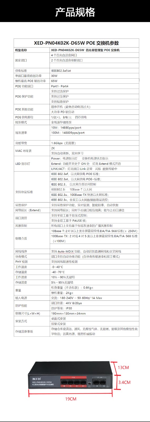 XED-PN04K02K-D65W是一款高性能的百兆POE交換機,可通過網線為無線AP,攝像頭等PD設備提供最大單端口30W供電,支持一鍵開啟網絡延長模式,突破網線百米限制,有效滿足遠距離供電布線傳輸需要;完全滿足新一代組網需求,適用家庭,酒店,中小企業等各類場景;為您構建更安全、更快速、可增值的可靠網絡。