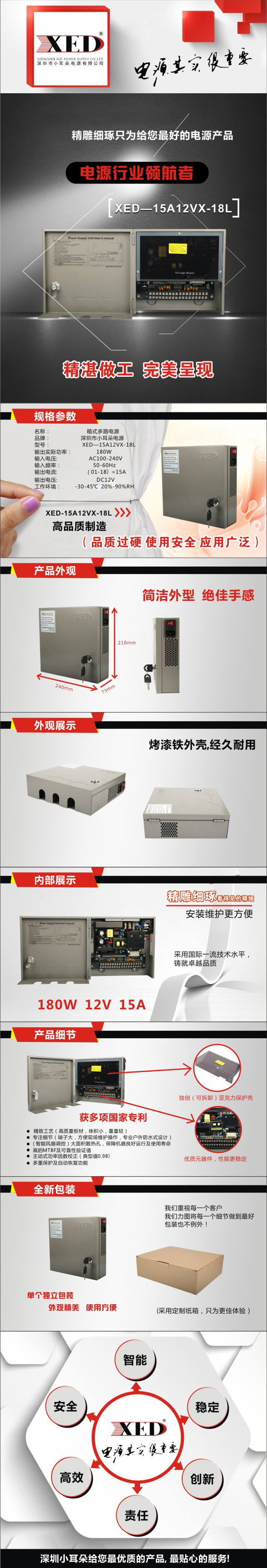 XED-15A12VX-18L箱式多路開關電源,18路穩壓開關電源,每一路標準足安12V15A,寬電壓AC100-240V輸入,適用室內外多路接入使用。