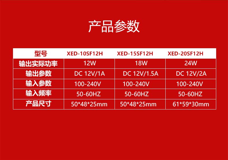 型號 XED-10SF12H 輸出實際功率 12W 輸入電壓 AC100V-240V 輸入頻率 50-60Hz 輸出電流 1A 輸出電壓 DC12V 工作環境 -30°—45°C 20%—90%RH 產品尺寸 L50 X W48 X H25(mm) 包裝數量 200PCS 毛重 - 配件 Certificates,合格證