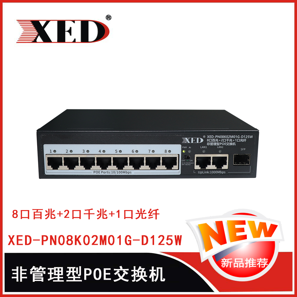 XED-PN08K02M01G-D125W是一款高性能的百加千兆POE交換機,可通過網線為無線AP,攝像頭等...
