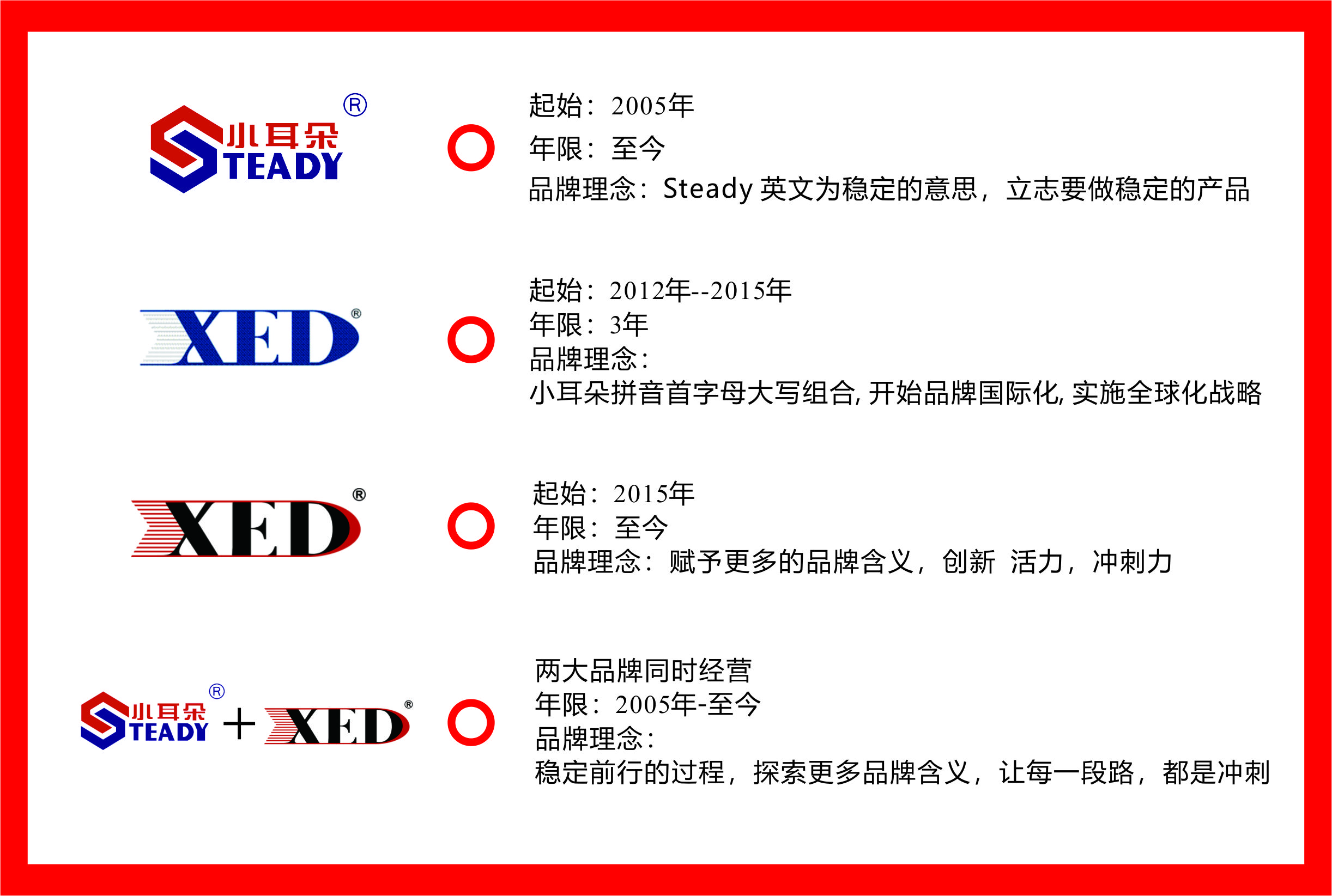 XED 是取“小耳朵”三字的拼音首起字母而組合天成,字母化小成大,以盎然佇立之態(tài),表信心堅固之意。X意:一心一意,意為由始即專;E意:產(chǎn)品性質(zhì),即,電子產(chǎn)品——電源;D意:強悍不屈的驅(qū)動力。圖案是一個火箭輪廓,尾部熊熊烈焰,象征活力源源。融字母與圖案之中,渾然相連。