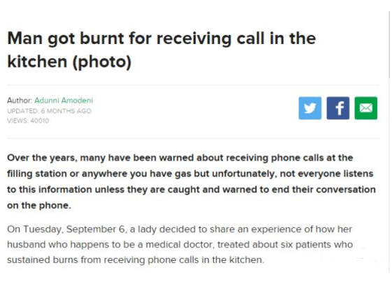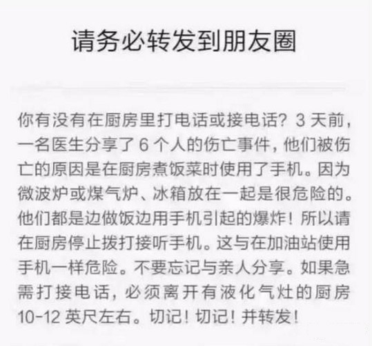 這則消息稱,在廚房里打電話容易引發爆燃事故,并引起盆友圈瘋狂的刷屏。
